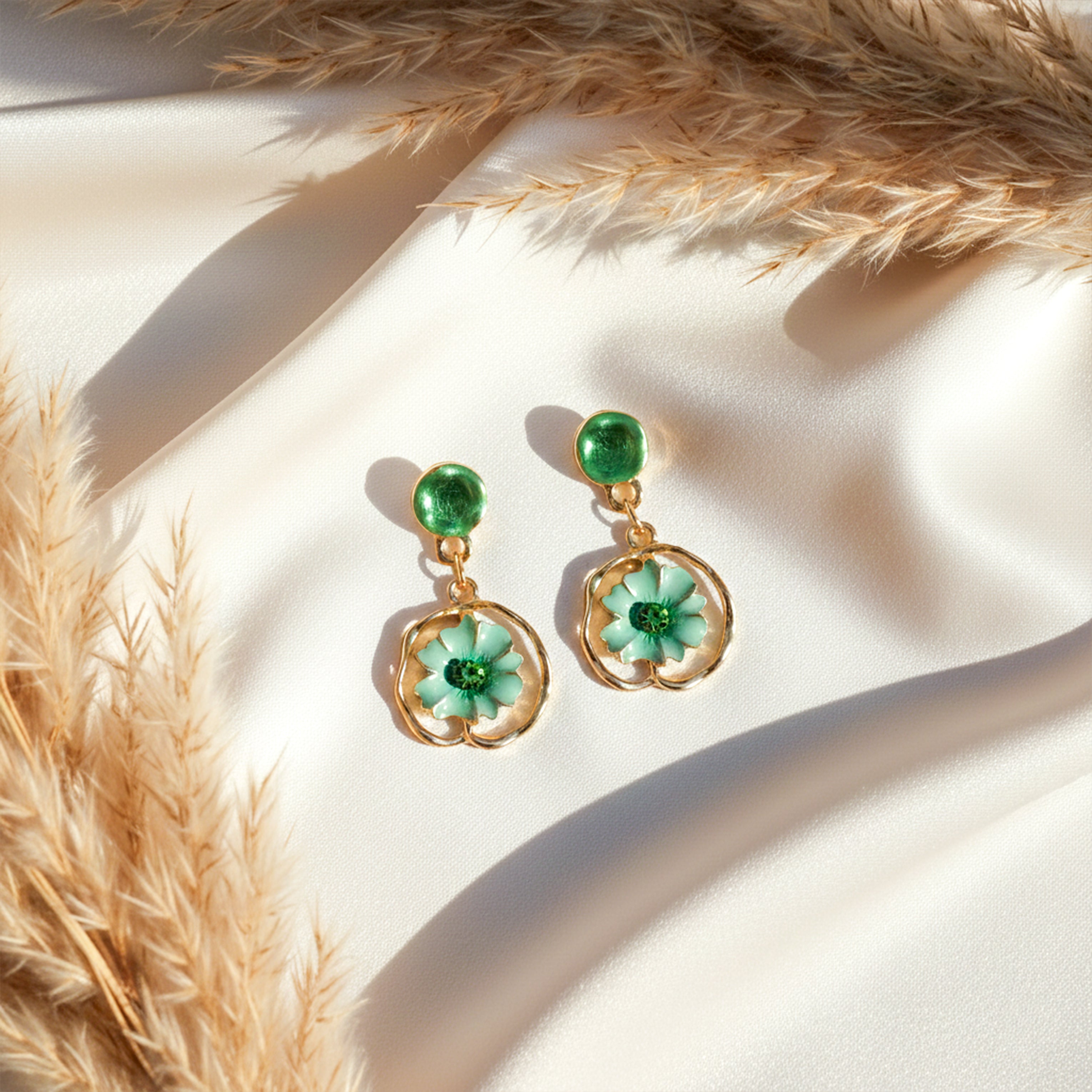 The soft mint floral design paired with a polished gold frame creates a fresh, modern look. These earrings are versatile enough to pair with kurtis, dresses, sarees, or western outfits, making them a must-have addition to any jewelry collection.